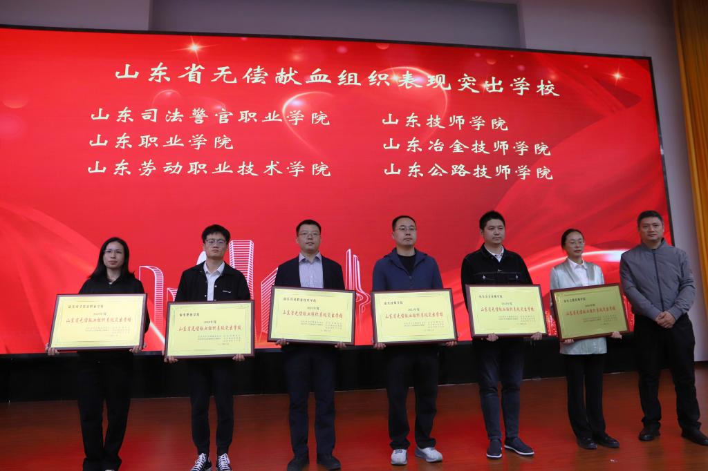 于金宣读了《关于表扬2023年山东省高校无偿献血表现突出集体及个人的通报》,与会领导为获奖集体和个人代表颁发奖牌和奖状。