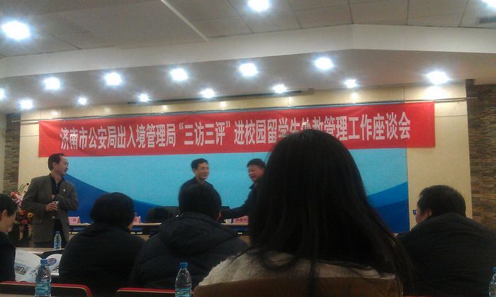 2月29日,济南市公安局出入境管理局“三访三评”进校园•留学生、外教管理工作座谈会在山东大学举行。济南市公安局出入境管理局局长李军、副局长王薇,山东省教育厅国际交流与合作处副处长孙祖兴,济南市外国专家局局长张宾等出席座谈会。我院受邀参加了本次座谈会。济南市42家具有接收留学生、聘请外教资质的大专院校和教育机构外事工作负责人70余人参加了座谈会。