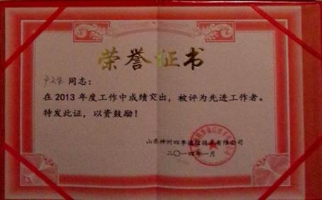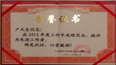 户天生同学2012年、2013年连续获得公司先进工作者称号