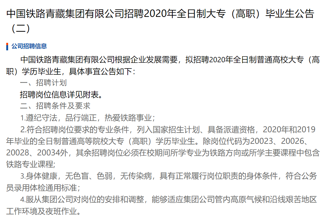 青藏铁路公司2020校园招聘大专(高职)毕业生岗位信息表