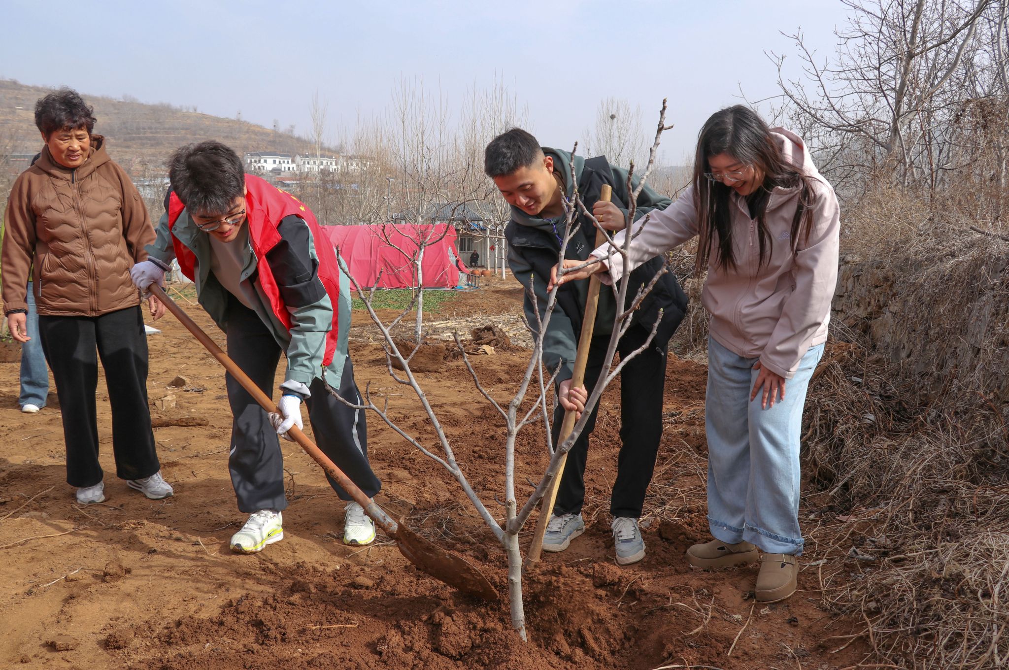 师生们热情高涨、干劲十足,大家分工明确,挥锹铲土、扶苗填坑、提水浇灌,现场一片热火朝天的劳动景象。经过共同努力,萌发新绿的无花果树苗和山楂树苗在河崖村“安家落户”,为黄河流域的生态建设增添一抹新绿,为保护黄河生态环境贡献了一份力量。