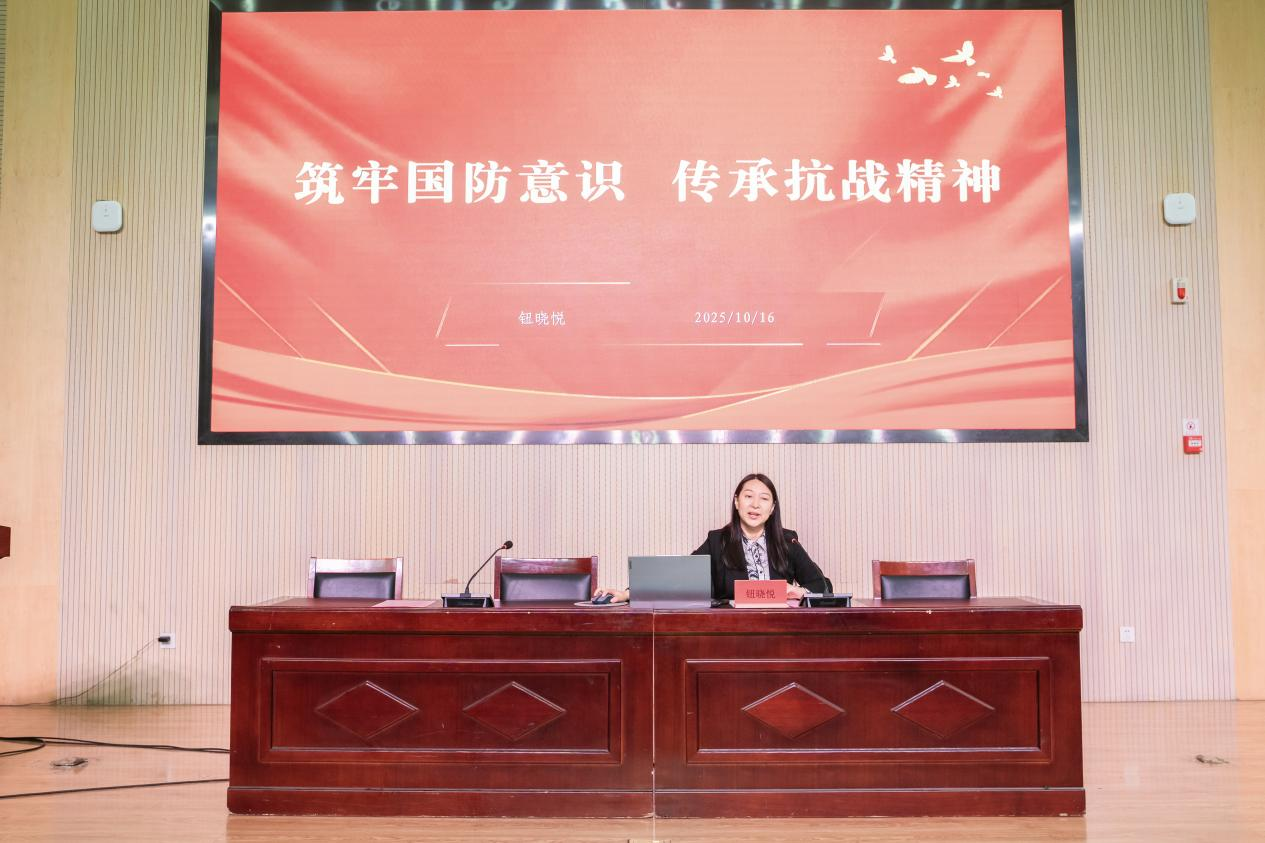 钮晓悦以《筑牢国防意识,传承抗战精神》为题,从历史与现实对比中深刻阐述了国防安全作为“人民幸福生活‘压舱石’”的重大意义,并结合书院智能制造、铁路通信等专业特色,指出其与国防现代化紧密相关,勉励学生夯实专业基础以服务强国兴军事业。通过解读抗战精神的四大核心内涵及英烈事迹,引导学生从中汲取力量,将红色基因转化为专业学习的动力和爱国报国的行动。在实践路径指引中,钮晓悦向学生提出三点希望:一要筑牢国防观念,争做安全意识的守护者;二要传承红色基因,争做抗战精神的弘扬者;三要勇担时代使命,争做技能报国的实干者。她特别强调,书院将为参军学生提供“一站式”服务保障,全力支持学子投身国防事业;同时鼓励广大学生立足专业学习,以“技能报国”的实际行动为强国兴军贡献青春力量。