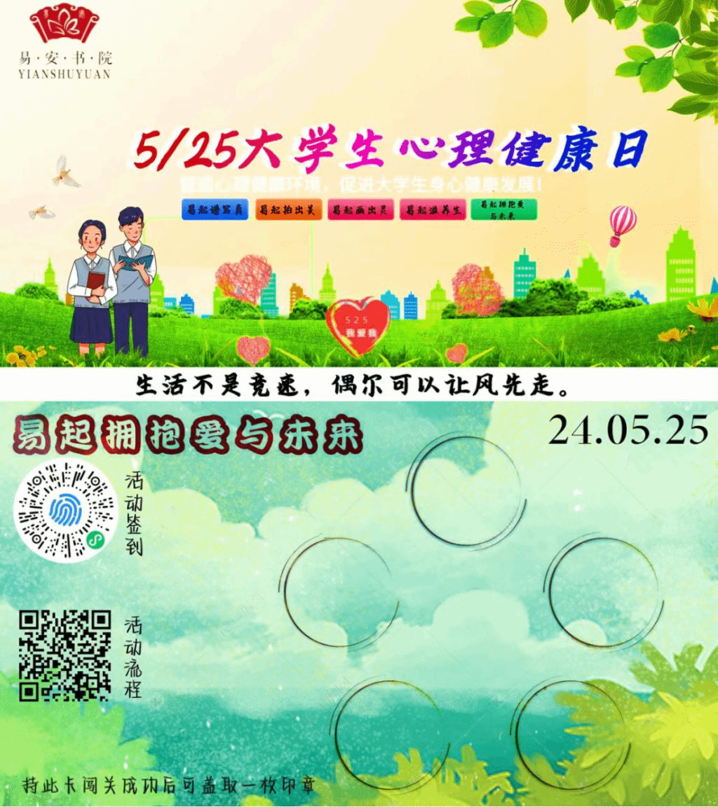 5月25日是我国的“大学生心理健康日”谐音“我爱我”,意为要认识自我、接纳自我,能体验到自我的存在价值,乐观自信。大学生即将进入社会,在人际交往情感问题团队协作等各种方面还不够成熟。普及相关知识和提高我院学生的心理素质,易安书院特此举办“525心理健康月”活动。