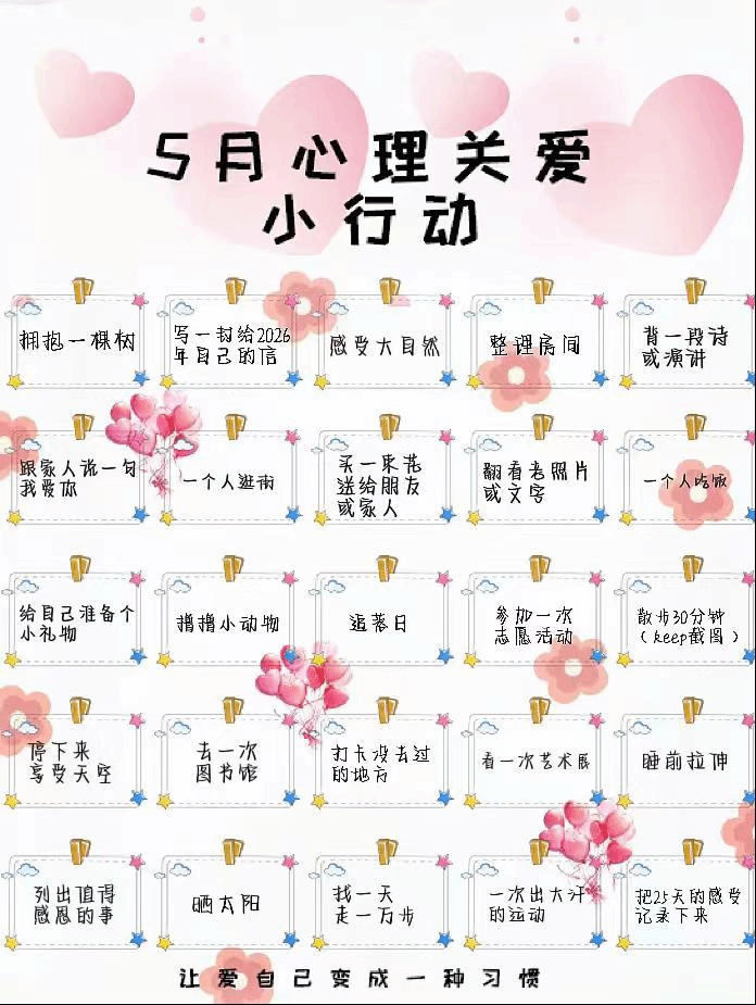 2.活动内容:人生路漫漫,过好当下的生活,去感受,去热爱。学生们通过完成25件小事,感受生活中的小确幸,营造幸福感,恢复能量。同时,激发学生们乐观、友善、勇敢等积极的心理品质,让爱自己变成一种习惯