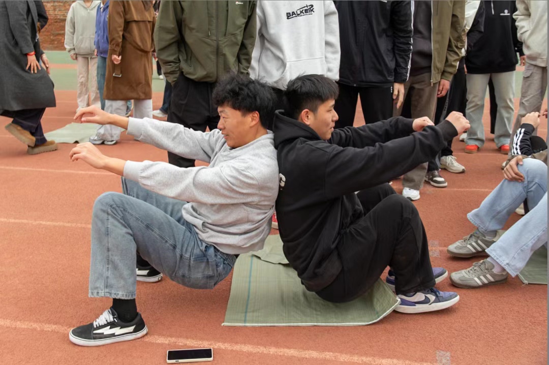 “坐地起身”游戏则考验团队协作,同学们背对背围成圈,从二人逐步增加至十人,全程不用手撑地起身。大家齐心协力,喊着口号,凭借顽强毅力和默契配合完成挑战。