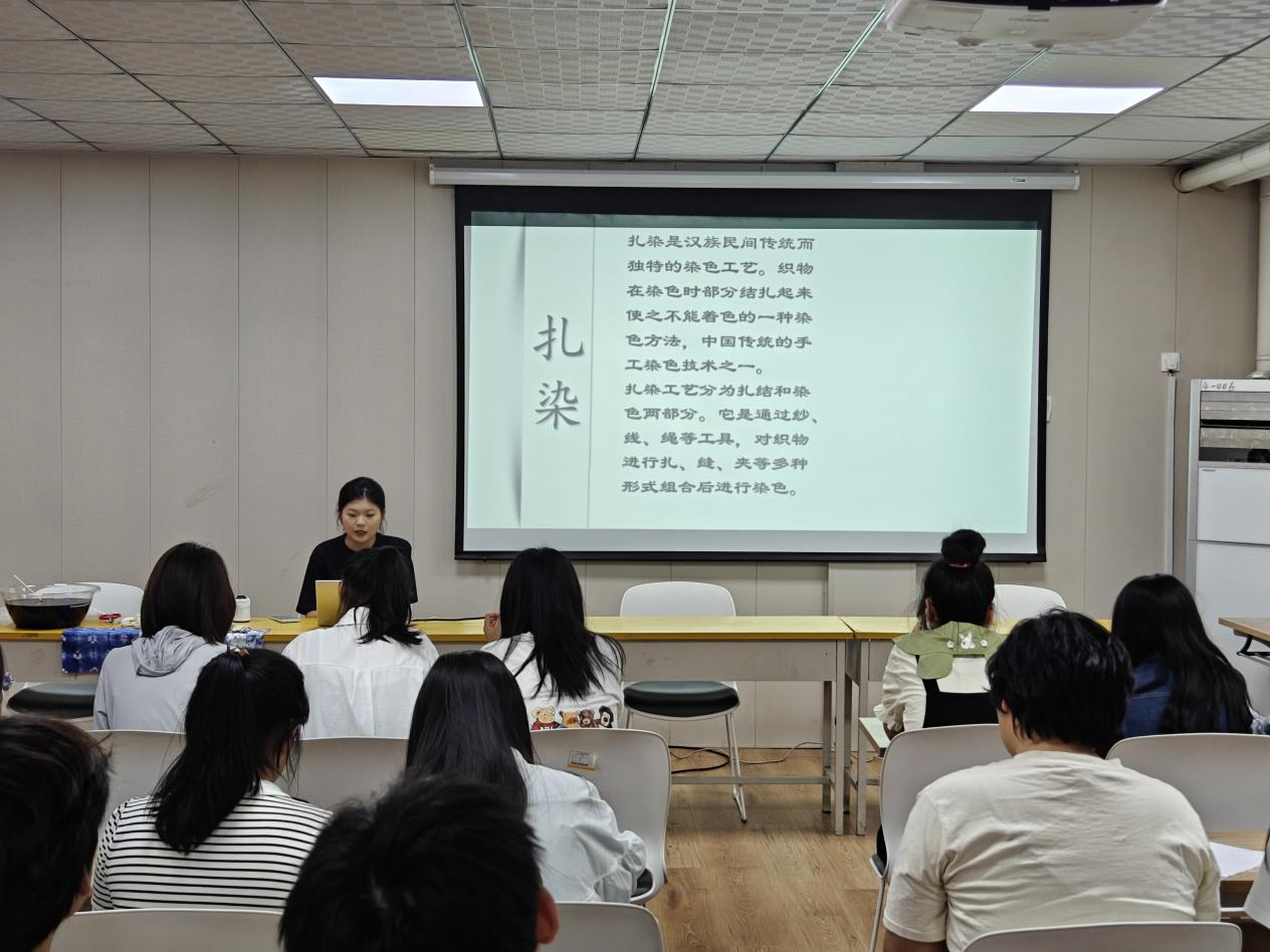 活动开始,王书弈同学为大家讲解扎染的由来、制作方法及过程的注意事项等内容。随后,同学们跃跃欲试,将手中洁白素净的棉布按照自己的想法随意缠绕、蜷曲,然后用皮筋一个个打结固定,并用五颜六色的染料进行浸泡、晕染,创作出自己的扎染作品。