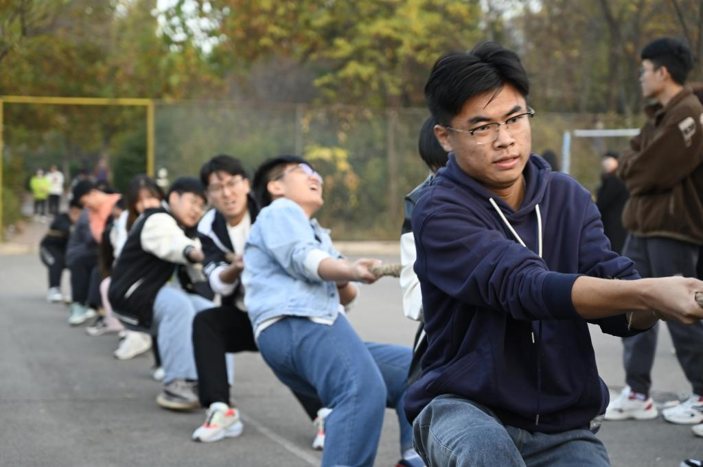 比赛打响,参赛选手紧握长绳,齐声高呼“一二,一二”,憋足力气拼命往后拉;场下啦啦队员为队员加油助威,呐喊声此起彼伏。一根小小的绳子在此刻凝聚了众人的力气,汇成一股强大的力量所向披靡。