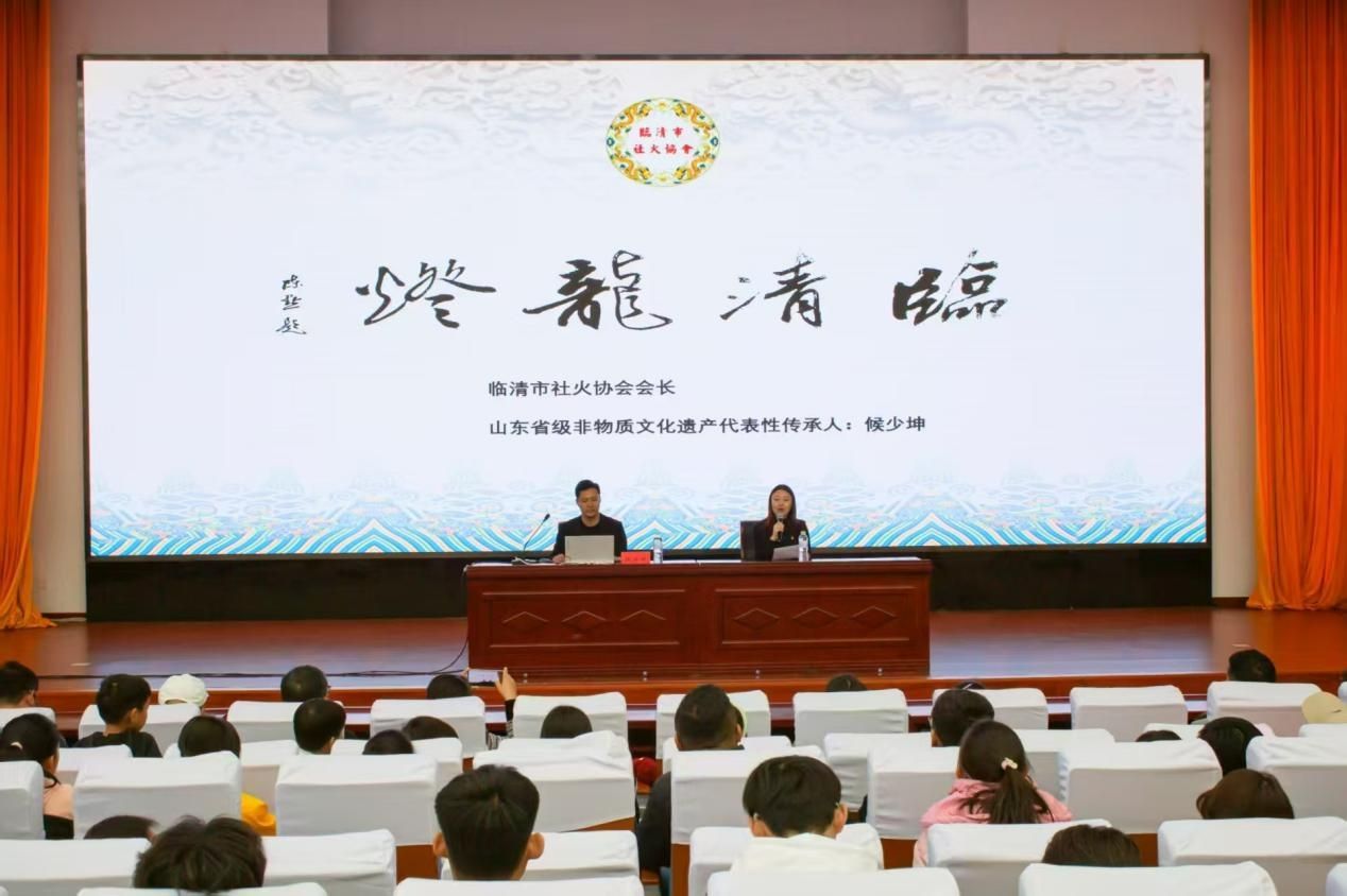 活动伊始,在图书馆行政楼西报告厅开展了“龙腾校园启新章,非遗薪火铸青春”主题讲座,讲座由桐林书院团总支书记赵呈然主持,山东省级非物质文化遗产代表性传承人侯少坤主讲,侯少坤介绍了非遗项目舞龙的起源、发展脉络与文化内涵,强调在实践中感受非遗魅力,传承非遗文化。随后,临清社火在喷泉广场开展舞龙表演并耐心教学舞龙的动作要领,小朋友们纷纷拿起工具,亲自体验传统技艺的深厚底蕴。