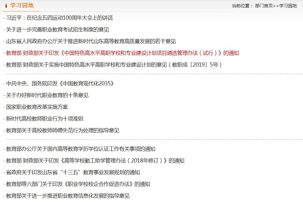 学院大力加强宣传工作,坚持宣传方针政策、宣传发展成果、宣传职教故事相结合。党委(学院)办公室在学习园地转载《习近平总书记在纪念五四运动100周年大会上的讲话》《中国教育现代化2035》《关于办好新时代职业教育的十条意见》《国家职业教育改革实施方案》《新时代高校教师职业行为十项准则》《教育部关于高校教师师德失范行为处理的指导意见》《山东省人民政府办公厅关于推进新时代山东高等教育高质量发展的若干意见》《中国特色高水平高职学校和专业建设计划项目遴选管理办法(试行)》《教育部财政部关于实施中国特色高水平高职学校和专业建设计划的意见》等重要讲话和政策文件。