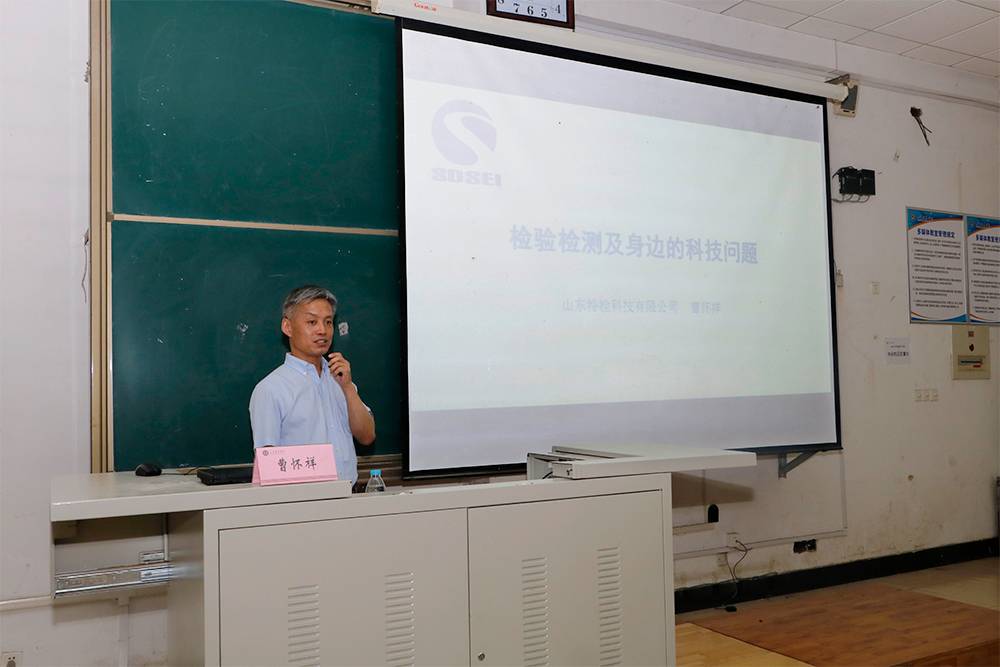 曹怀祥教授是工学博士,工程技术应用研究员,是享受国务院特殊津贴的专家,是山东省质量技术监督局首席检测师,特种设备高级检验师。多年来,曹教授主持国家级科研课题4项,荣获省部级科技成果一等奖,是山东省有突出贡献的中青年专家。聘任仪式后,曹教授作了《检验检测及身边的科技问题》专题报告,围绕机电设备的参数检测装置开发、机械设备及部件的状态检验、科技问题的研究攻关方向等方面进行讲解。