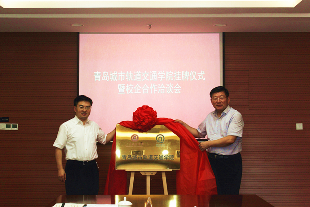 9月11日,我院与青岛地铁在青岛举行青岛城市轨道交通学院揭牌仪式暨校企合作交流会。学院党委书记王荣昌与青岛地铁集团副总经理、运营公司总经理刘高军共同为青岛城市轨道交通学院揭牌。