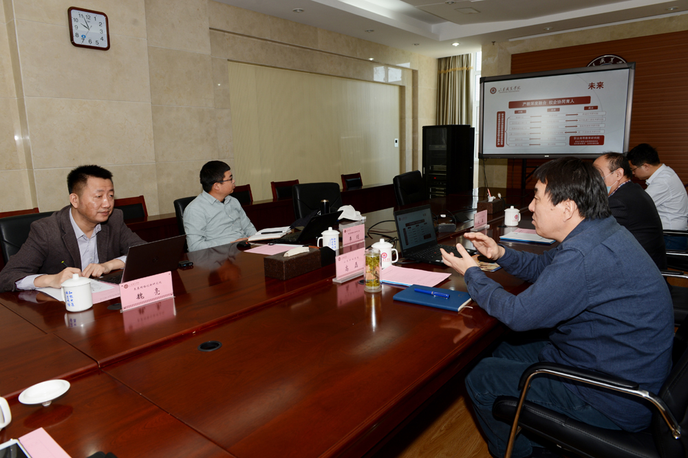 高磊向客人介绍了学院发展情况、特色优势以及学院的未来发展规划,重点向客人介绍了学院正在进行的为深入推进产教融合,强化校企资源整合共享,提高人才培养培训产出质量,促进就业创业,面向产业行业组建二级学院、构建产学研一体化机制、探索创立多类型产教融合协同育人新模式等的情况。