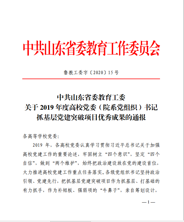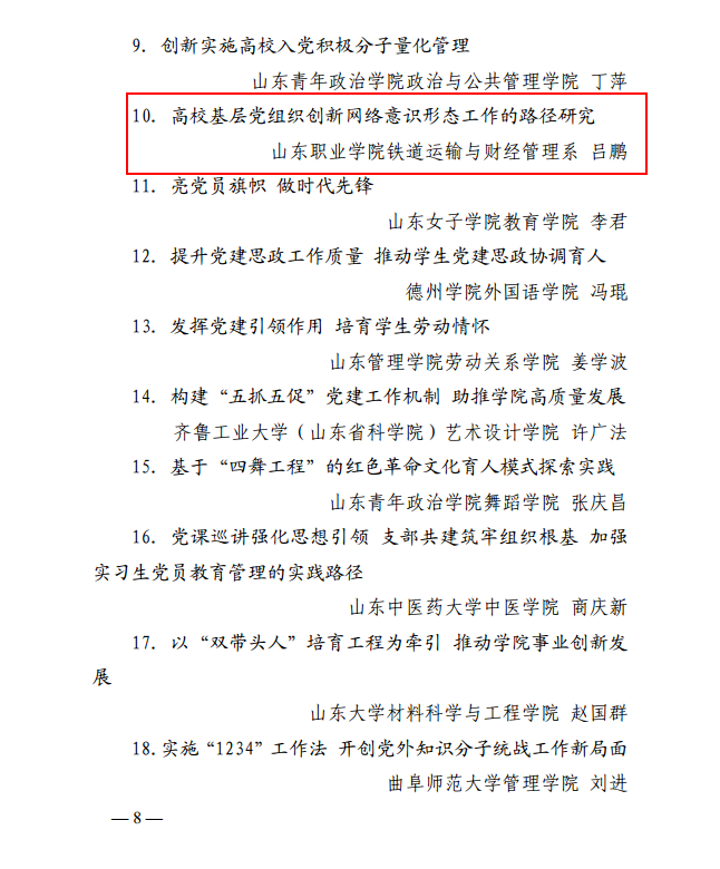 近日,中共山东省委教育工委发文,对全省25个高校党委书记抓基层党建突破项目优秀成果和25个高校院系党组织书记抓基层党建突破项目优秀成果进行了通报表扬。我校铁道运输与财经管理系党总支书记吕鹏同志抓基层党建突破项目成果《高校基层党组织创新网络意识形态工作的路径研究》被评选为优秀成果。