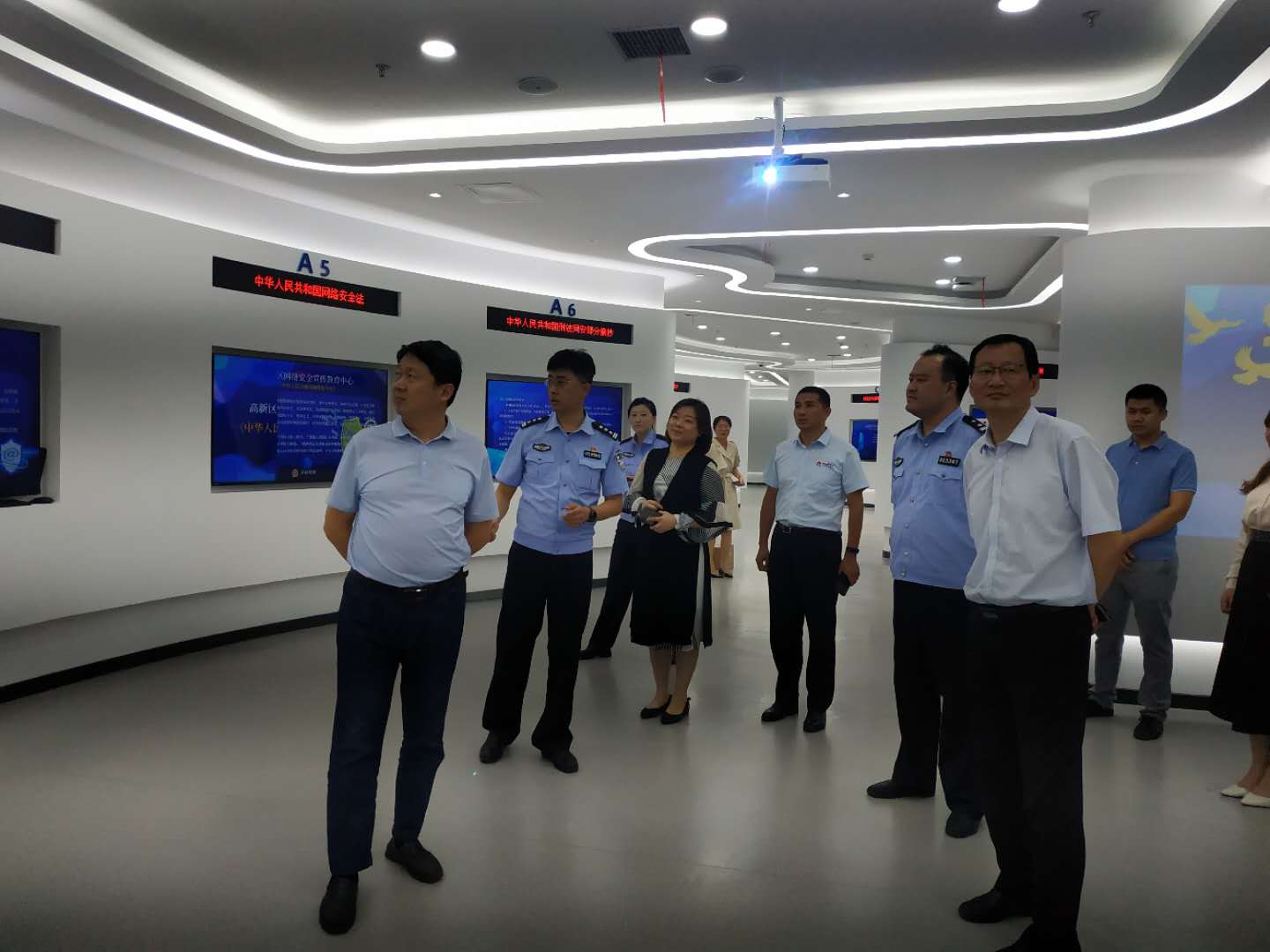 李攀对郭培谦一行的到访表示欢迎,并简要介绍了济南市公安局高新分局网警工作的基本情况,带领参观了济南市公安局在高新区人工智能大厦建设的“网络安全宣教中心”。中心负责人员还介绍了“枫桥式”互联网智慧园区的基本情况,分享了有害信息防控和网络舆情的发现与处置等方面的经验。