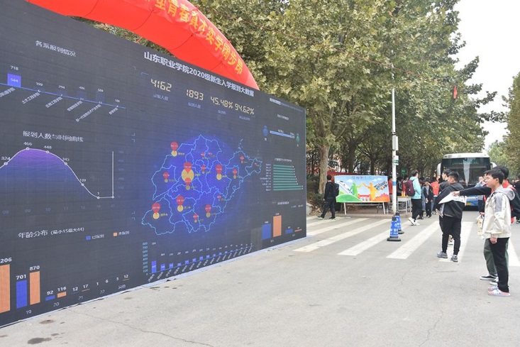 学校迎新生报到工作因“大数据”而更加高效周到,广昆路上的电子大屏幕随着新生陆续报到,实时更新显示已报到人数、各专业报到情况、新生的姓氏、生源地分布等数据,引来新生和家长们不断驻足围观。