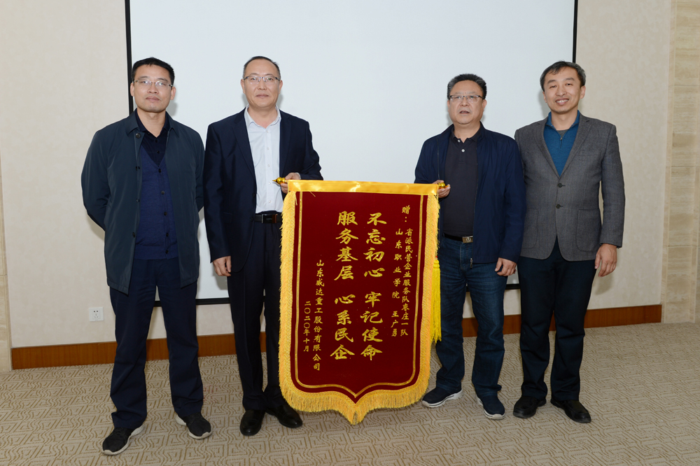 10月29日上午,山东威达重工股份有限公司副总经理、财务总监韩杰和公司综合办公室主任徐伟伟专程来到Beplay体育官方网站,向学校赠送了锦旗,感谢学校派出干部对企业的帮助和支持。副院长郭鹏接待了来访客人。