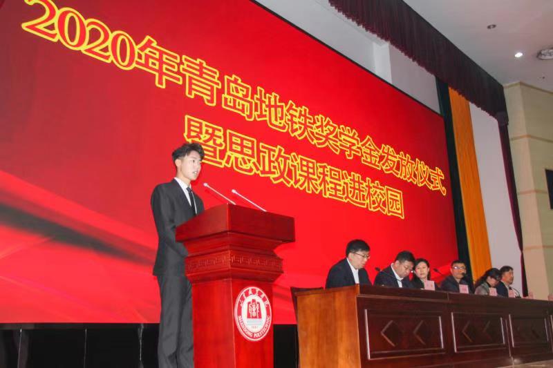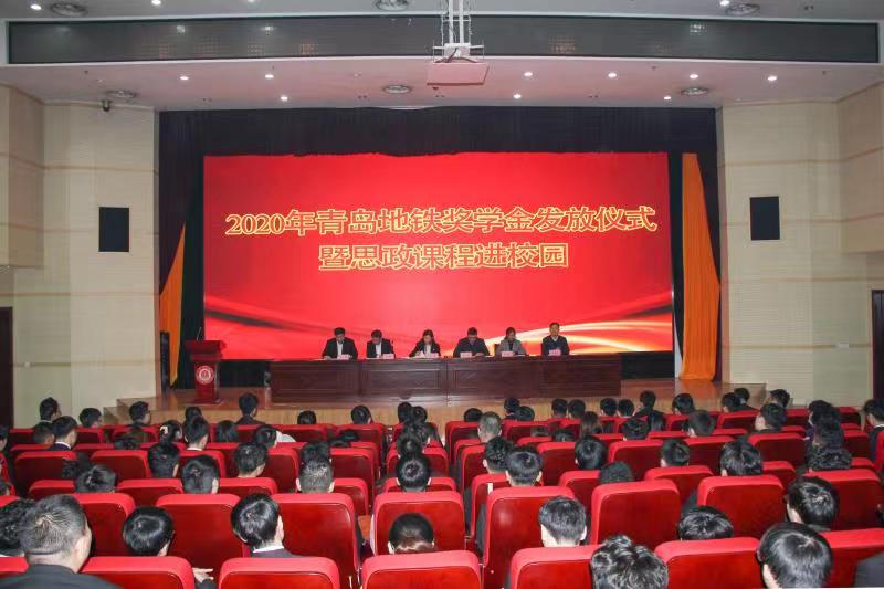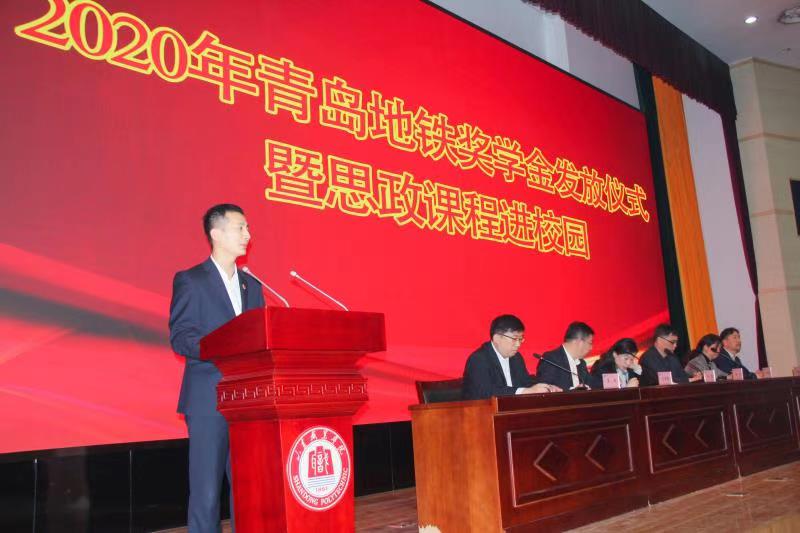 11月13日上午,我校2020年度青岛地铁奖学金颁发仪式暨思政课程进校园活动在图书行政楼西报告厅举行。青岛地铁集团党群工作部部长李昱、青岛地铁运营分公司副总经理迟胜超、学校党委副书记徐冬出席活动并讲话。本次活动由学生工作处处长王伟主持,2018、2019级青岛地铁全体学生参加。