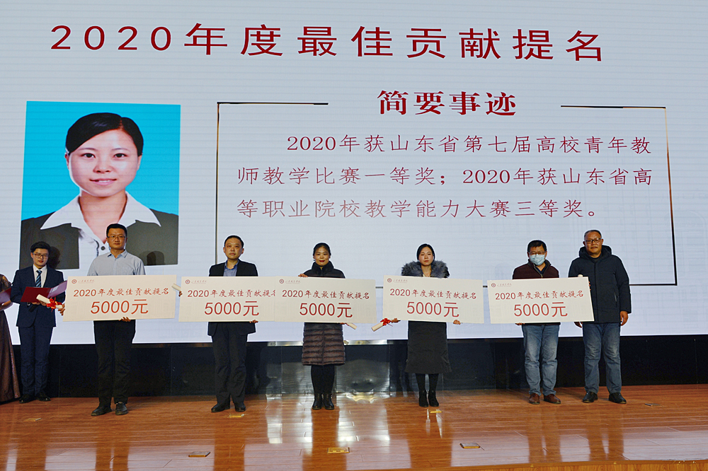 纪委书记祝介安向总务处郑恒、学生工作处王宁、易安书院张锦、铁道学院梁雪、铁道学院王志亮颁发了2020年度最佳贡献提名。