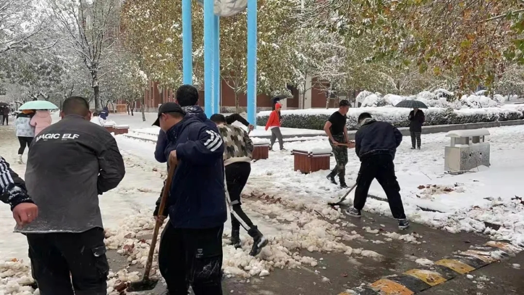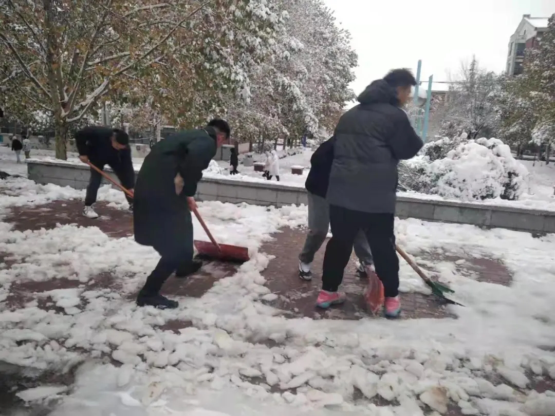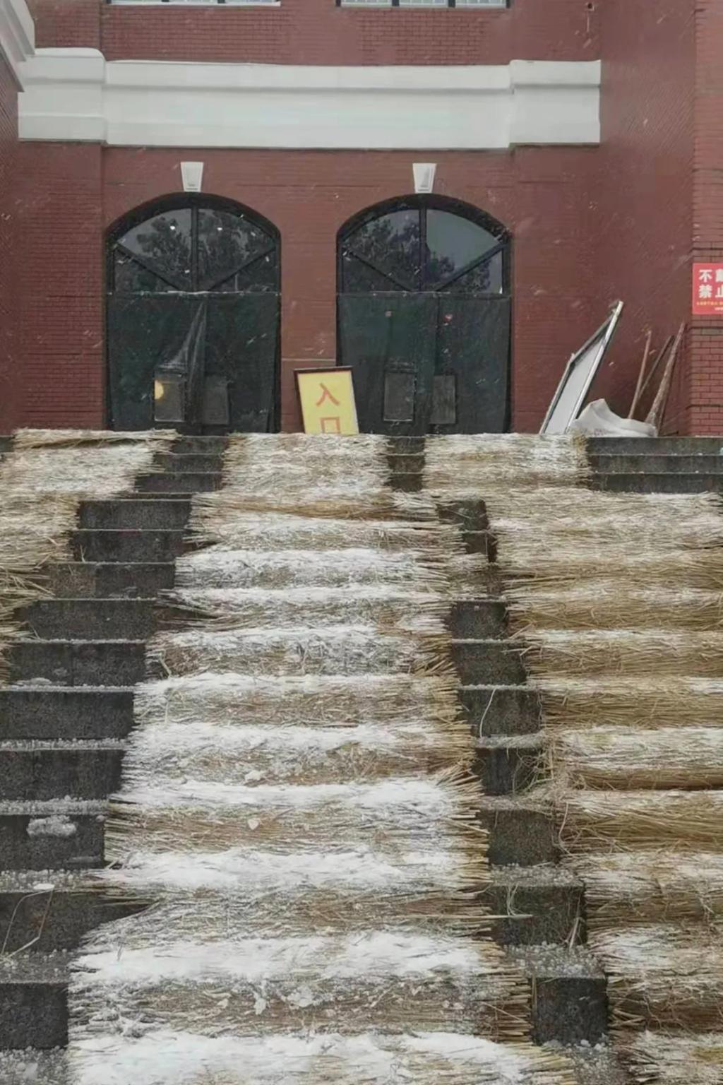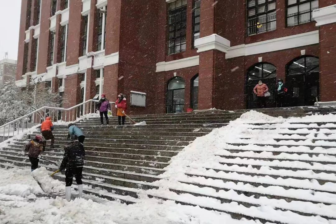 为确保师生的出行安全,大雪尚未停止,我校物业、安保、餐厅人员,已经开始清扫学校各主要马路,打开主要人行通道,在教学楼入口处放置除滑地毯,在台阶上放置草笘子防滑。谢谢大家,你们辛苦了!