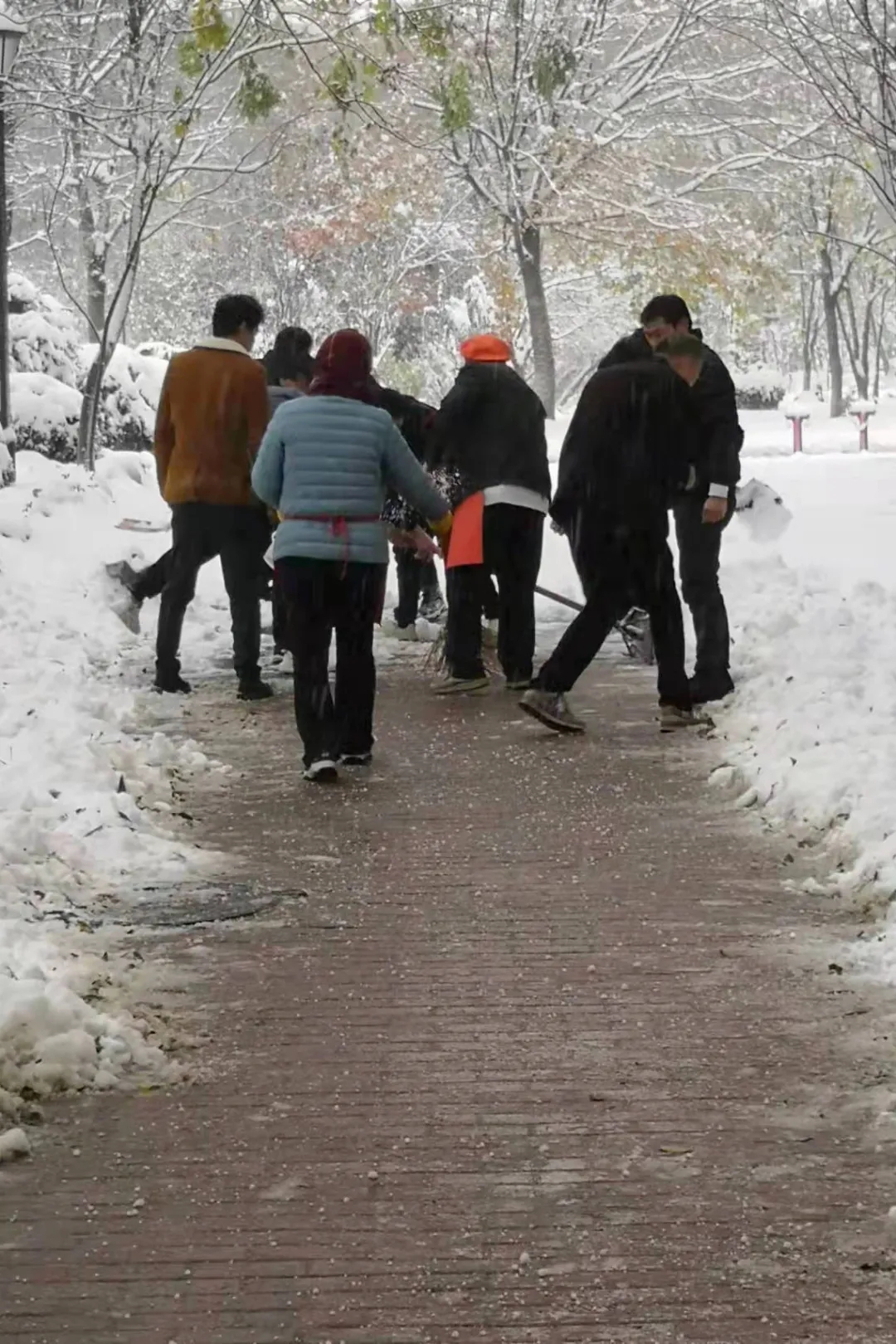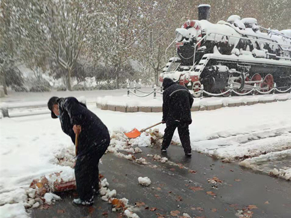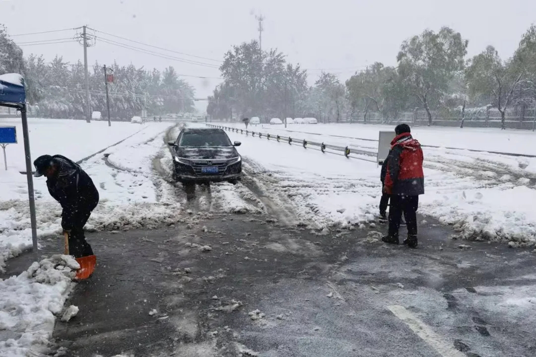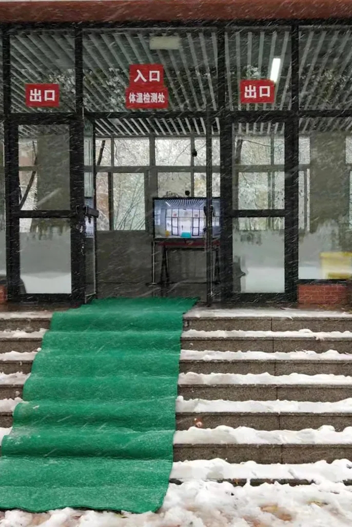为确保师生的出行安全,大雪尚未停止,我校物业、安保、餐厅人员,已经开始清扫学校各主要马路,打开主要人行通道,在教学楼入口处放置除滑地毯,在台阶上放置草笘子防滑。谢谢大家,你们辛苦了!