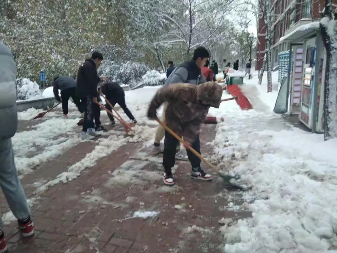 各书院学生也积极加入到大雪清理队伍中来,清理积雪。看还有赤膊上阵的同学,同学们,你们辛苦了!