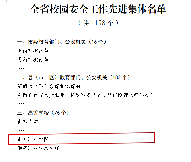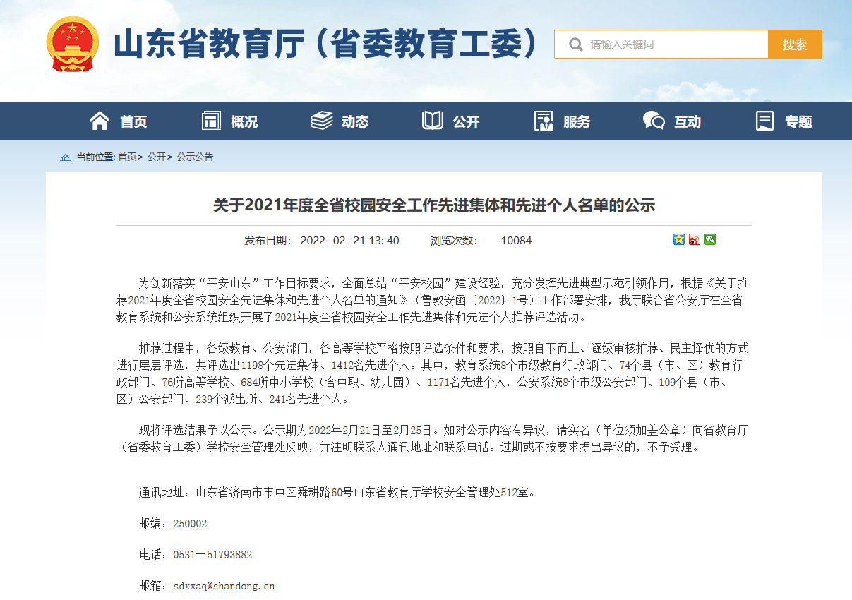 2月21日,山东省教育厅发布《关于2021年度全省校园安全工作先进集体和先进个人名单的公示》,我校获评2021年度全省校园安全工作先进集体,学校安全保卫处处长吕鹏被评为2021年度全省校园安全工作先进个人。