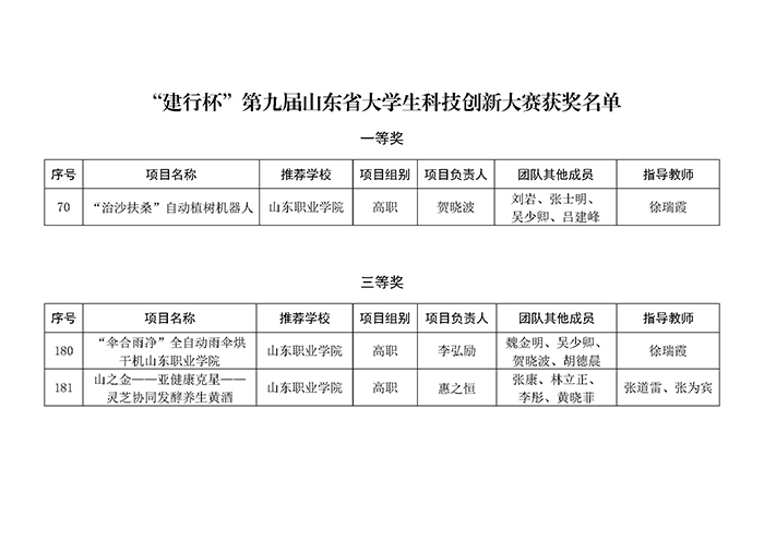 近日,山东省教育厅公布了“建行杯”第九届山东省大学生科技创新大赛获奖名单,我校荣获一等奖1项,三等奖2项。