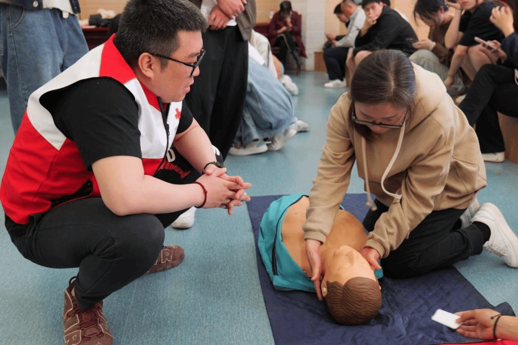 培训中,两位讲师详细讲解了手臂包扎法、头顶帽式包扎法等六种创伤救护包扎技术和心肺复苏的详细步骤以及自动体外除颤仪(AED)的使用方法。师生两人一组进行了实践练习,两位讲师现场指导,及时纠正实操中存在的问题。