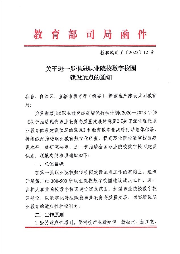 近日,教育部职成司下发《关于进一步推进职业院校数字校园建设试点的通知》(教职成司函〔2023〕12号),我校成功入选教育部第一批职业院校数字校园建设试点院校。