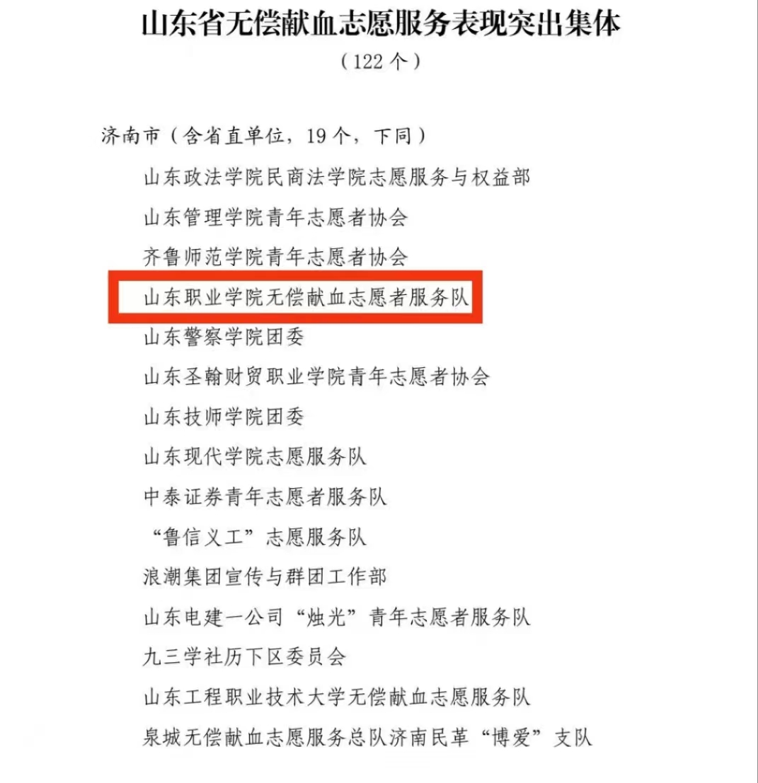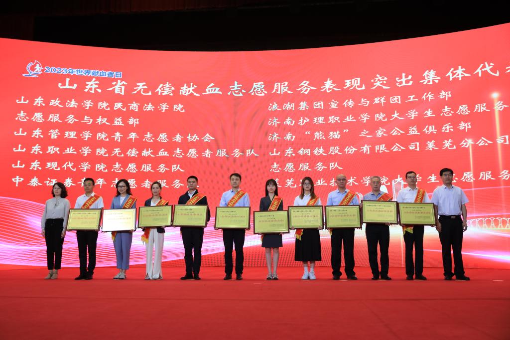 6月14日,由山东省卫生健康委举办的山东省2023年世界献血者日宣传活动在济南南郊宾馆举行。现场对2021-2022年度山东省无偿献血工作表现突出的集体及个人进行了表彰,我校的Beplay体育官方网站无偿献血志愿者服务队荣获“山东省无偿献血志愿服务表现突出集体”荣誉称号。