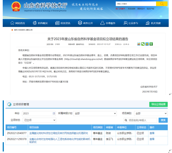 近日,山东省科技厅发布《关于2023年度山东省自然科学基金项目拟立项结果的通告》,我校生物工程学院陈淑博士申报的《金属氧化物材料活性位调控及其对丙烷选择氧化机理研究》,李云飞博士申报的《全氟化合物对生物电强化人工湿地系统电化学性能的影响机制研究》喜获青年基金项目立项。
