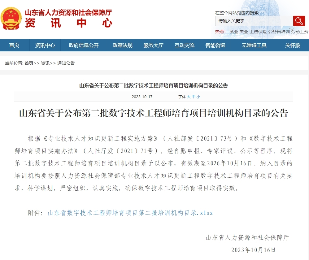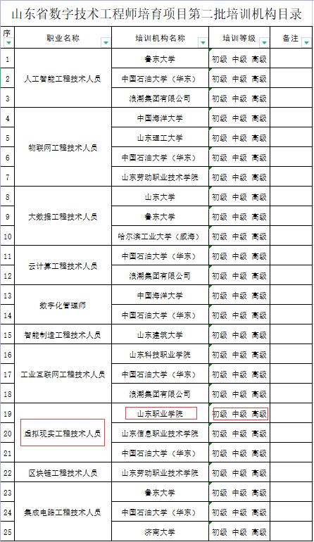 近日,山东省人力资源和社会保障厅公布了第二批数字技术工程师培育项目培训机构目录公告,我校继续教育学院与新一代信息技术产业学院联合申报的虚拟现实工程技术人员(初级、中级、高级)成功入选。全省共有13家单位入选,我校为4家入选高职院校之一。