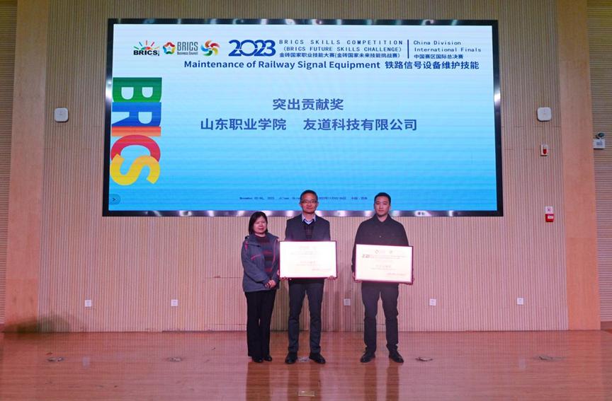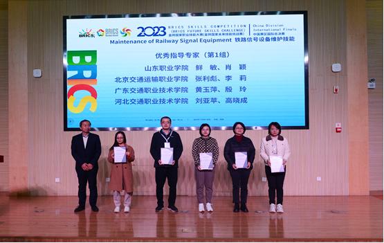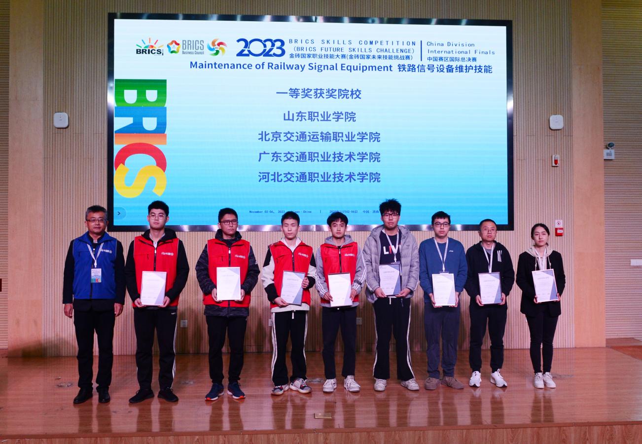 11月2日-6日,2023金砖国家职业技能大赛“铁道信号设备维护技能”赛项在我校举行,共有44支参赛队伍88名选手一同竞技,其中来自金砖国家的4支队伍、8名国际选手参加了线上比赛。我校乌拉尔国际轨道交通学院郭宏林、赵威凯组成的代表队,在鲜敏、肖颖两位老师的指导下荣获金牌。鲜敏、肖颖获“优秀指导专家”,学校获“突出贡献奖”。