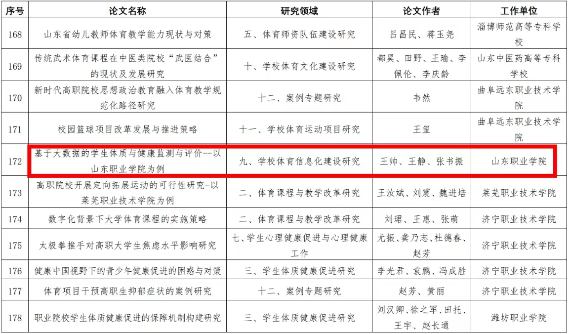 学校高度重视此次论文评选工作,积极组织教师撰写相关论文,校内筛选4篇论文参加省级评选。最终,由李奎申报的《职业能力导向下高职“学练赛益”体育育人模式构建》,国翠香申报的《利用人工智能 AI、大数据、云计算等信息技术对学生进行体质测试的应用研究》获得一等奖,王帅申报的《基于大数据的学生体质与健康监测与评价--以Beplay体育官方网站为例》获得三等奖。