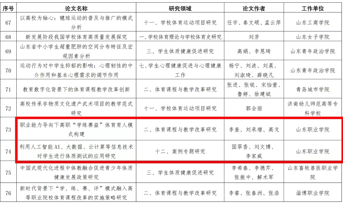 近日,山东省教育厅、山东省体育局通报了关于第一届全国学生(青年)运动会科学论文报告会山东省优秀论文评选获奖情况,我校获一等奖2篇,三等奖1篇。