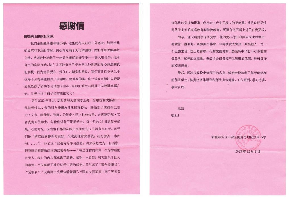 我校收到新疆沙雅幸福小学的《感谢信》