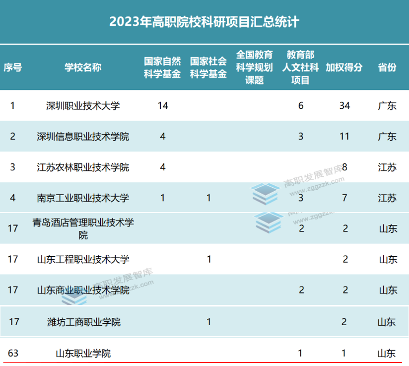 本次榜单统计了2023年高职院校获得的国家自然科学基金、国家社会科学基金、全国教育科学“十四五”规划2023年度课题、教育部人文社科项目的立项情况。其中,国家社会科学基金包括年度项目、教育学单列项目、艺术学单列项目、后期资助项目等,教育部全国教育科学规划课题包括教育部重点、教育部青年、教育部专项,教育部人文社科项目包括一般项目、高校思想政治理论课教师研究专项、中华优秀传统文化专项课题(A类)。