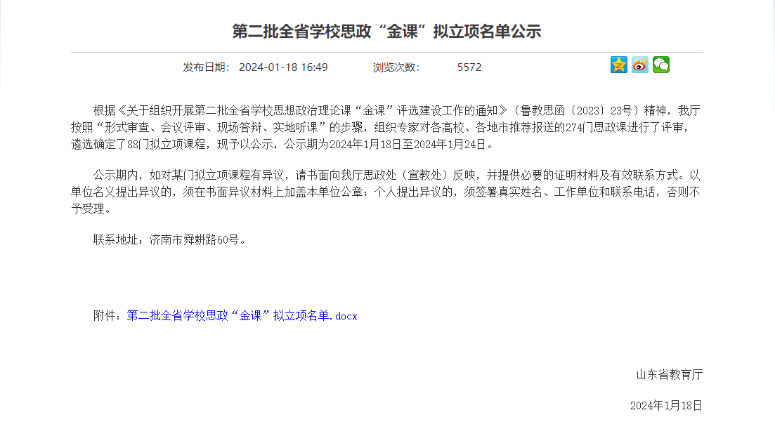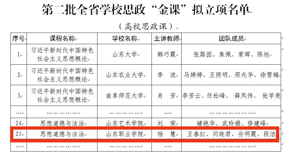1月18日,山东省教育厅公布了《第二批全省学校思政“金课”拟立项名单公示》,我校马克思主义学院杨慧主持,王春红、闫晓君、孙明霞、段洁组成的教学团队申报的《思想道德与法治》课程成功入选。