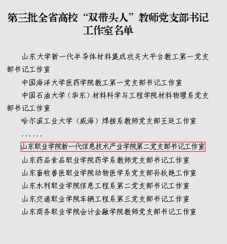 3月6日,中共山东省委教育工委公布第三批全省高校“双带头人”教师党支部书记工作室建设名单,我校新一代信息技术产业学院第二党支部书记工作室成功入选。这是我校继获批全国样板党支部、全省党建工作标杆院系、样板党支部之后,获批的又一重要党建培育创建项目。