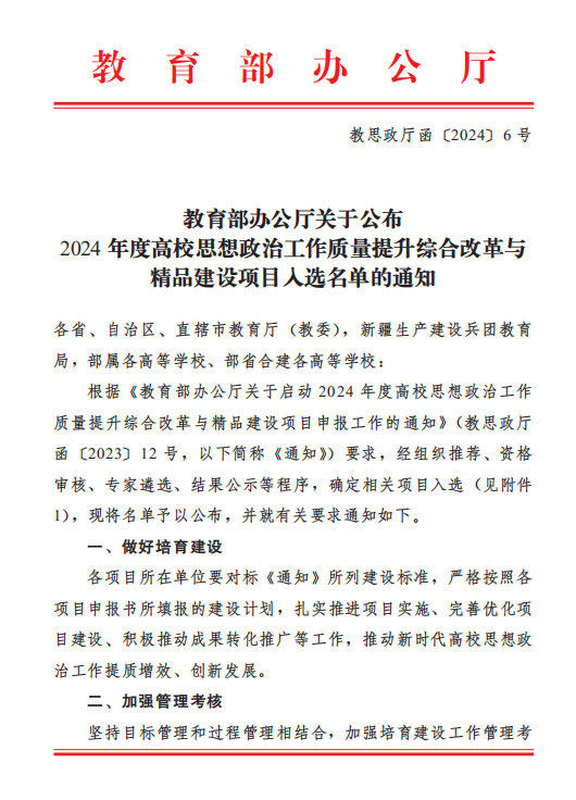 我校2个项目获批2024年度高校思想政治工作质量提升综合改革与精品建设项目