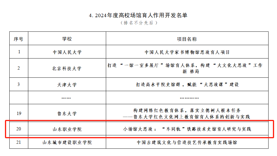 近日,教育部办公厅下发《关于公布2024年度高校思想政治工作质量提升综合改革与精品建设项目入选名单的通知》(教思政厅函〔2024〕6号),我校宣传部申报的《小场馆大思政:“车同轨”铁路技术史馆育人研究与实践》入选“高校场馆育人作用开发”项目,这是宣传部继2022年获批教育部高校思想政治工作精品项目《“勇往直前,敢为人先”——“铁•道”文化育人体系的构建与实施》后又一重要成果。同时,易安书院副院长张锦主持的“山栀花网络思政工作室”入选“高校辅导员名师工作室”,实现了我校国家级辅导员名师工作室零的突破。