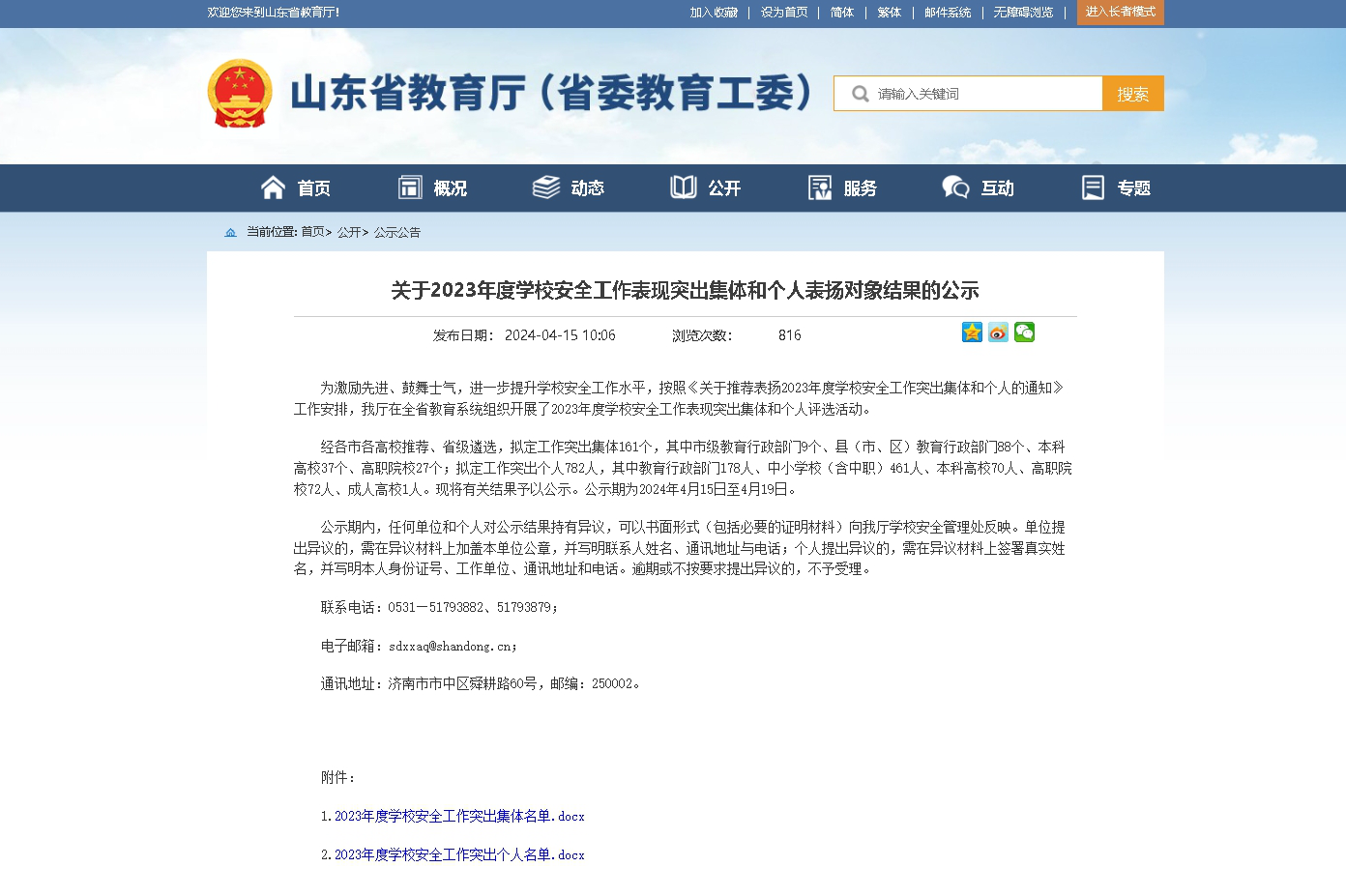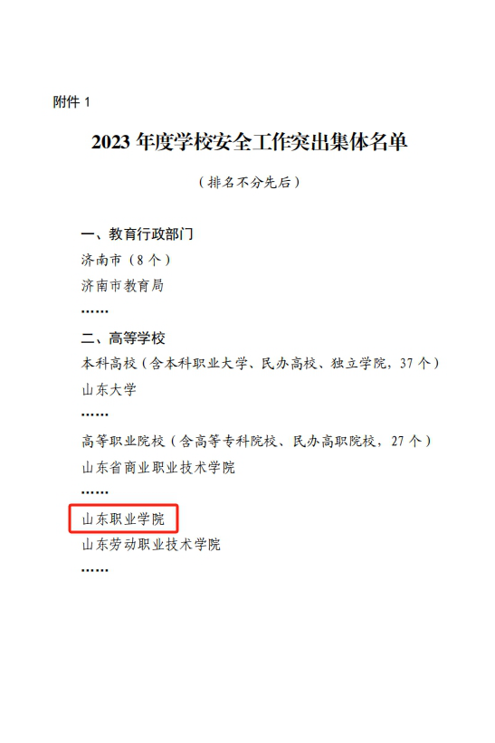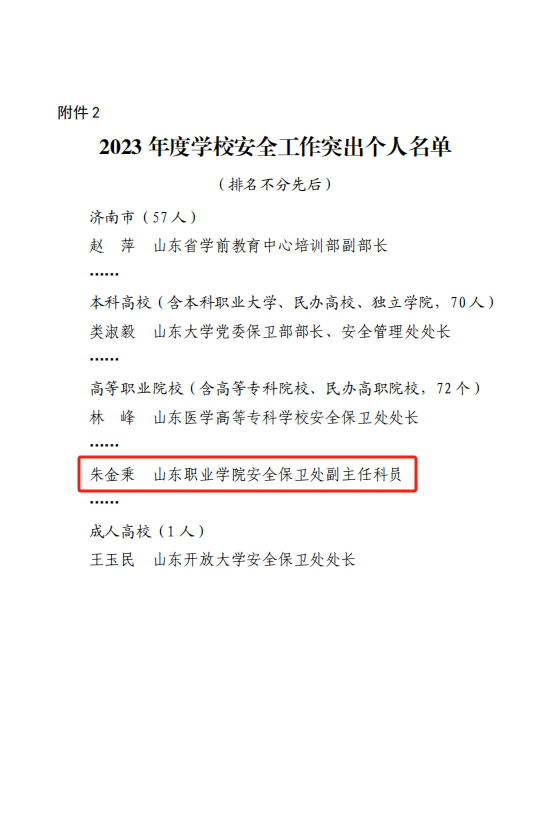 4月15日,山东省教育厅下发《关于2023年度学校安全工作表现突出集体和个人表扬对象结果的公示》,我校获评2023年度学校安全工作突出集体,安全保卫处朱金秉被评为2023年度学校安全工作突出个人。