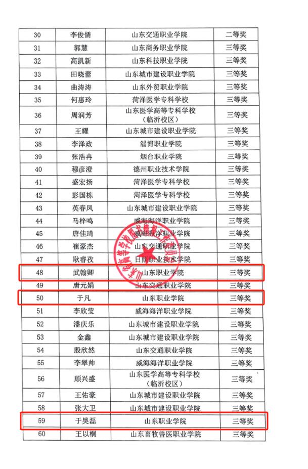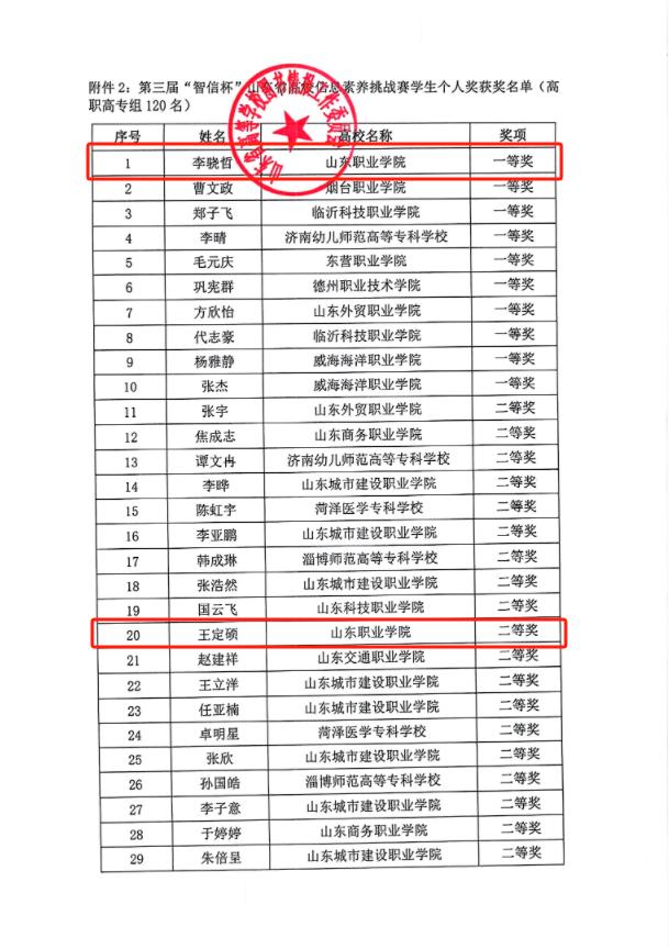 近日,第三届“智信杯”山东省高校信息素养大赛挑战赛落下帷幕,我校再次取得优异成绩。李骁哲以高职高专组全省第一的好成绩获得一等奖,王定硕获得二等奖,武翰卿、于凡、于昊磊获得三等奖,王子浩、刘天乐等12名同学获得优秀奖。我校获优秀组织奖,图书馆常威、孙娜获优秀指导教师奖。
