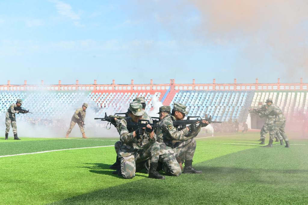 战地救护,搜索前进,格斗、战术表演,一招一式,刚劲有力,动作娴熟,节奏分明,充分展现了军训教官们斗志昂扬、意气风发的青春风貌。
