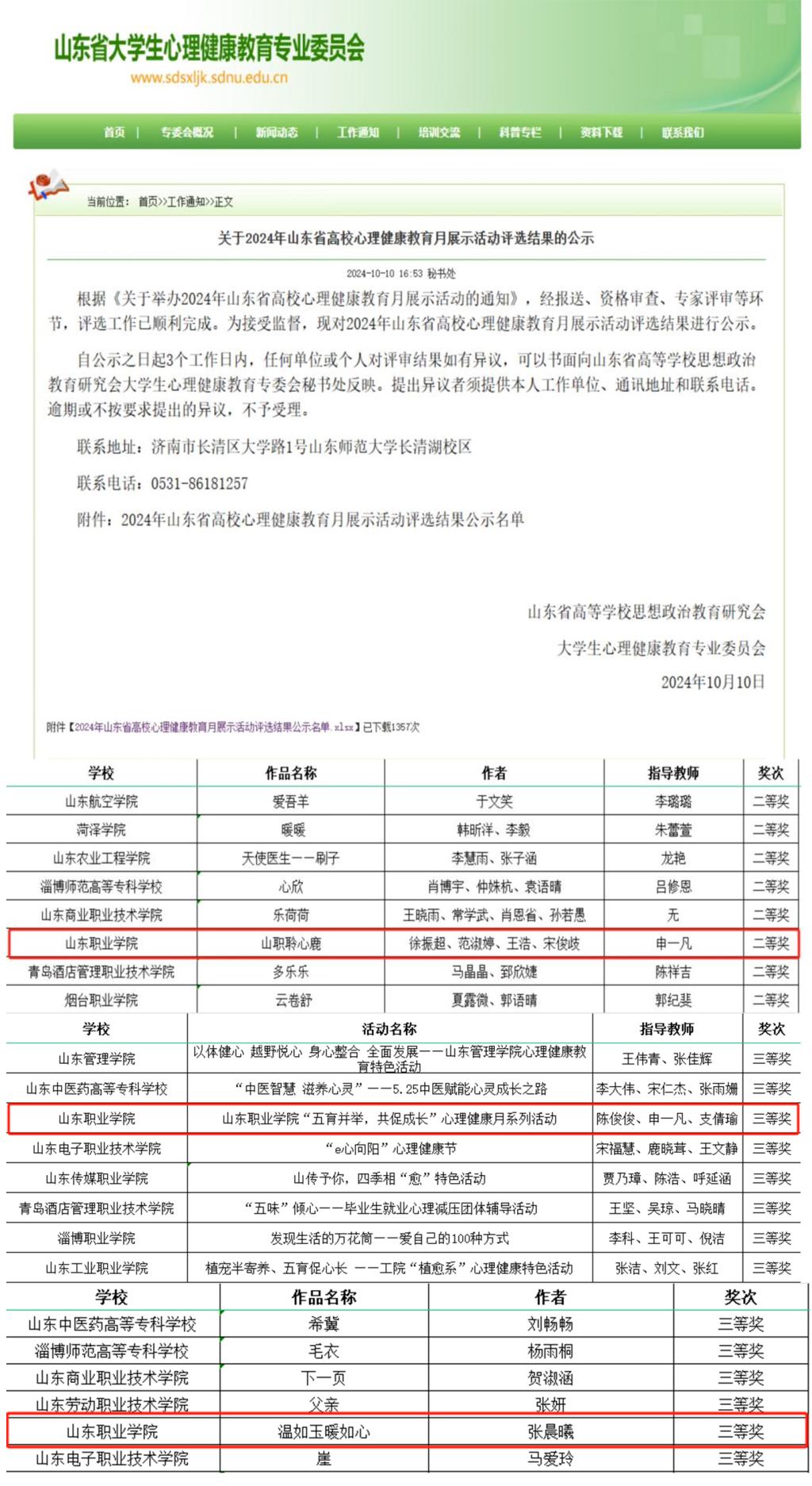 近日,山东省高校思想政治教育研究会大学生心理健康教育专委会公布了2024年山东省高校心理健康教育月活动评选结果,我校荣获二等奖1项、三等奖2项。