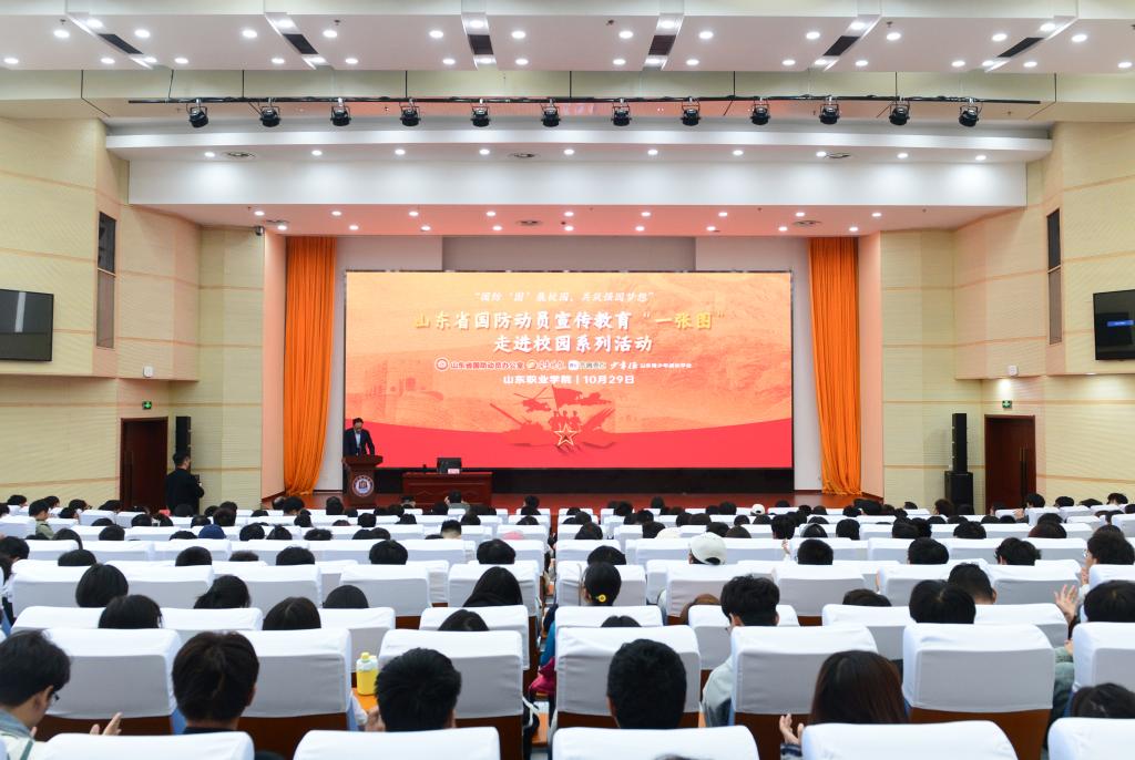 10月29日上午,山东省国防动员宣传教育“一张图”走进校园系列活动第三站在我校成功举行,此次活动以“国防‘图’展校园,共筑强国梦想”为主题,这是该系列活动首次走进高职院校,全校近400名师生参与。