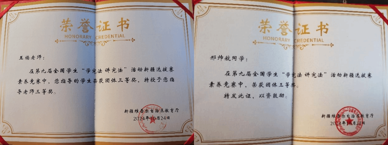 近日,第九届全国学生“学宪法 讲宪法”活动新疆选拔赛获奖名单公示。我校援派喀什职业技术学院教师王楠指导的学生邢帅航在众多参赛选手中脱颖而出,以第8名的成绩荣获自治区三等奖,实现了该校在此项赛事上“零”的突破。同时,王楠获得“三等奖指导教师”荣誉称号,也成为本批山东援疆教师中的首位获奖者。