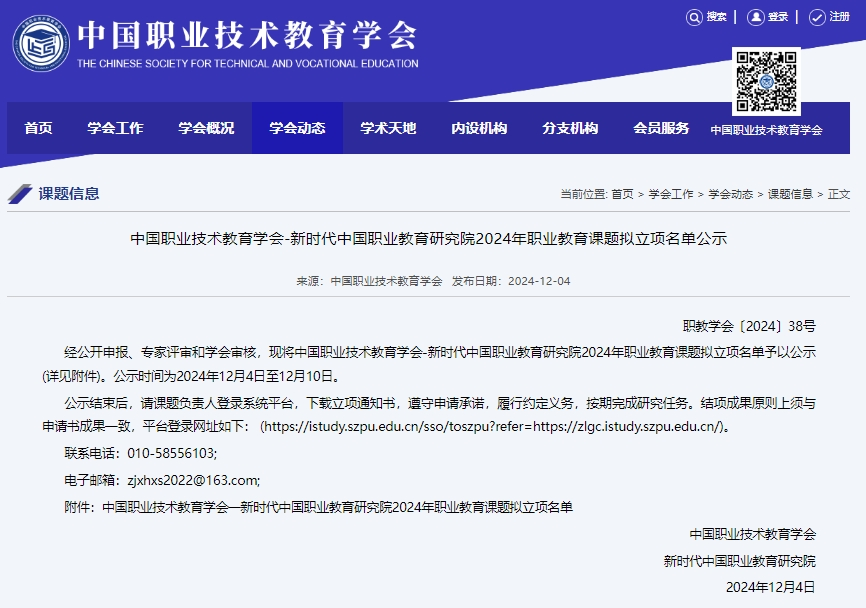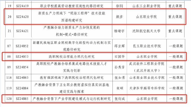 12月5日,中国职业技术教育学会-新时代中国职业教育研究院2024年职业教育课题拟立项名单公示。我校申报的《新质生产力视域下“现场工程师”技术技能图谱构建研究》《高职院校治理能力现代化研究》《产教融合背景下产业学院建设模式与运行机制研究》共3项课题入选。