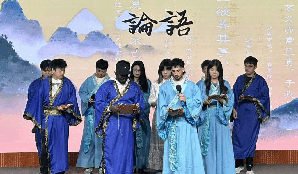 经典诵读活动中,中外学子们身着传统服饰,手捧竹简,采用中英俄三种语言诵读儒家经典,诠释着对古老智慧的感悟。“有朋自远方来,不亦乐乎……”诵读声此起彼伏,《论语》在他们抑扬顿挫的诵读声中焕发出新的生命力。
