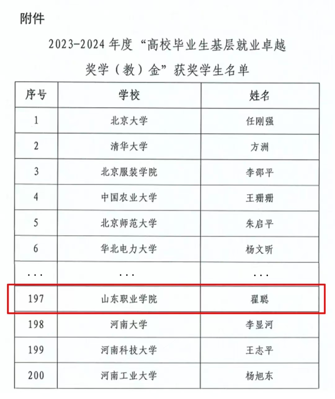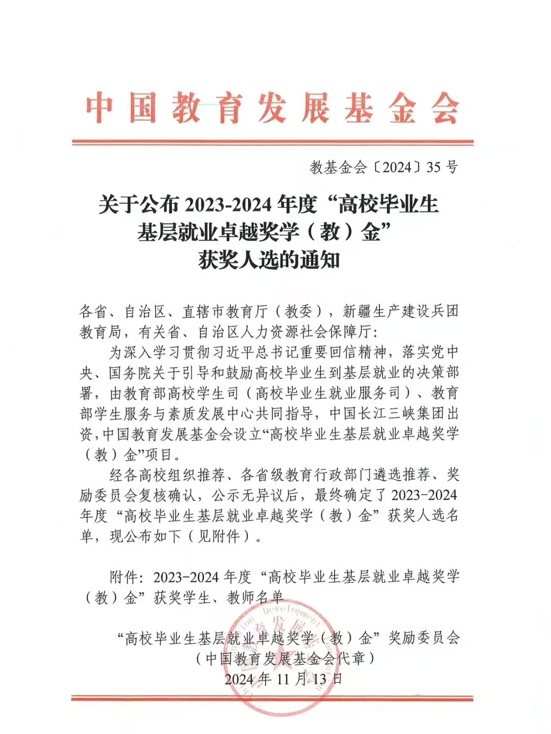 近日,中国教育发展基金会公布2023-2024年度“高校毕业生基层就业卓越奖学(教)金”获奖人选,我校优秀毕业生翟聪成功入选。